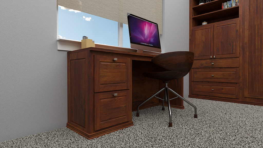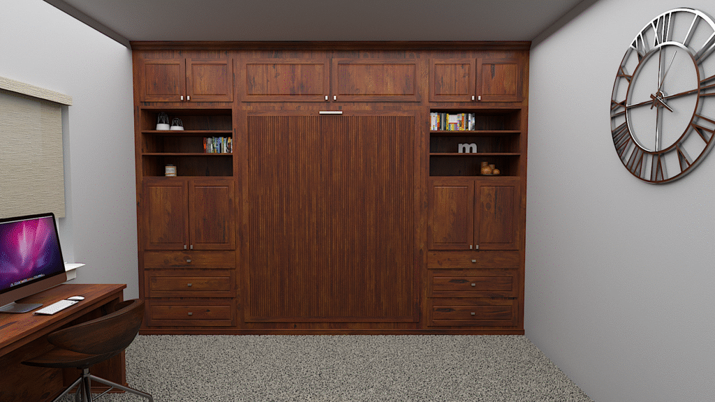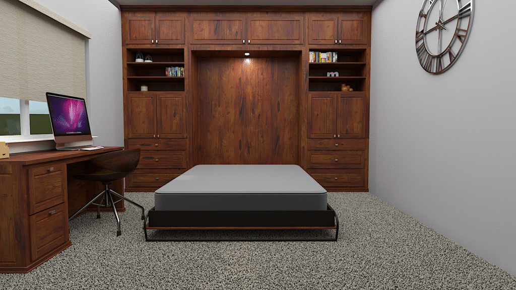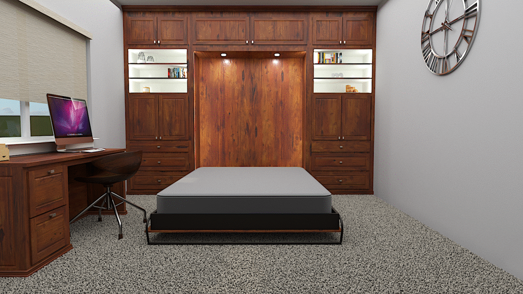 Added additional puck light, cabinet lighting and painted open shelves SW Extra WhiteSide Cabinets with Shelves & Simple Wall Bed Frame for ArtSide Cabinets with Shelves & Tamboured Panel for Wall BedDesk with Filing Cabinets ClosedDesk with Filing Cabinets OpenSide View of DeskFront View of DeskSide View of DeskWall Bed Open